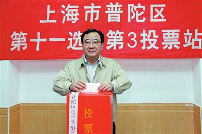 区委书记张国洪前往设在普雄路26弄的普陀区第十一选区第三投票站。张书记的到来,受到选民们的热烈欢迎。张国洪从工作人员手中领了一张选票,认真地填写后投下庄严一票。临走时,张国洪和工作人员及选民们握手问候。