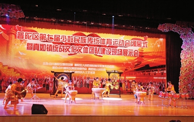 闭幕式结束后,与会领导和运动员一起观赏了由真如镇统战文化文体团队带来的文艺汇演。气势磅礴的鼓乐《蛟龙戏珠》拉开了文艺汇演的帷幕,这部作品由真如中学民盟支部表演,在今年举办的全国第六届打击乐比赛中荣获金奖。近年来,真如镇的统战工作坚持以统战文化建设为平台,并通过对群众文体团队建设的引导,于2009年底成立了“真如镇统战人士艺术团”,下设合唱、舞蹈、时装、戏曲和民乐等文艺团队,健身操、太极拳、乒乓球和台球队等体育团队,共12支文体团队,成员涵盖了镇域内所有层面的统战人士。真如镇以特色工作为抓手,以构建大统战格局为目标,通过积极探索和实践,扎实推进统一战线自身科学发展,走出了一条具有真如特色的基层统战工作新路子。