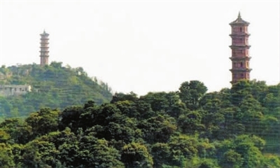 舟行所见最著名古迹当首推罗浮双塔。双塔分别矗立在龟、蛇二山上。龟山位于江南岸,匍匐如龟:蛇山位于江北岸,蜿蜒如蛇,它们隔江对峙,相距仅180米,其山巅之双塔,皆始建于西晋,重修于明。