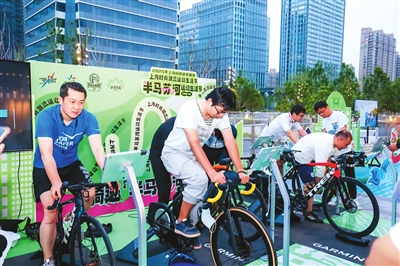 “半马苏河”运动生活节商圈挑战赛的第一站在上海真如环宇城MAX开启。五一当天,“Give me 5运动五项挑战赛”现场人流涌动。骑行、乒乓、VR滑雪、划船机和匹克球五项趣味任务吸引市民争相打卡(上图)。