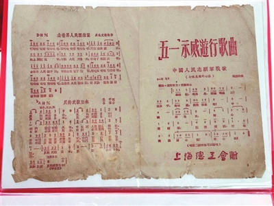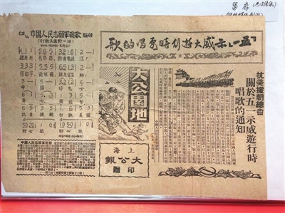 1951年5月1日,总工会组织了一次全上海的游行,声援抗美援朝,游行中高唱这首《中国人民志愿军军歌》。王旭清为了纪念当时特殊日子,就一直保存着这份报纸。