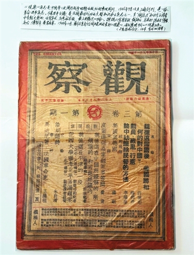 ■《观察》杂志是中国第三次国内战争时期出版的时事性周刊,1946年9月1日在上海创刊,是一份革命进步杂志。储安平主编,是民国最为成功的大型知识分子杂志之一,在“国统区”知识分子读者中有较大影响,出有华北、台湾航空版,最高发行量达10万份。撰稿人有梁实秋、钱钟书、马寅初、冯友兰、傅雷、吴晗、傅斯年、费孝通等。1948年12月,蒋介石亲自下令国民党政府查封《观察》,造成震惊中外的《观察事件》。(来自王旭清手写标注)
